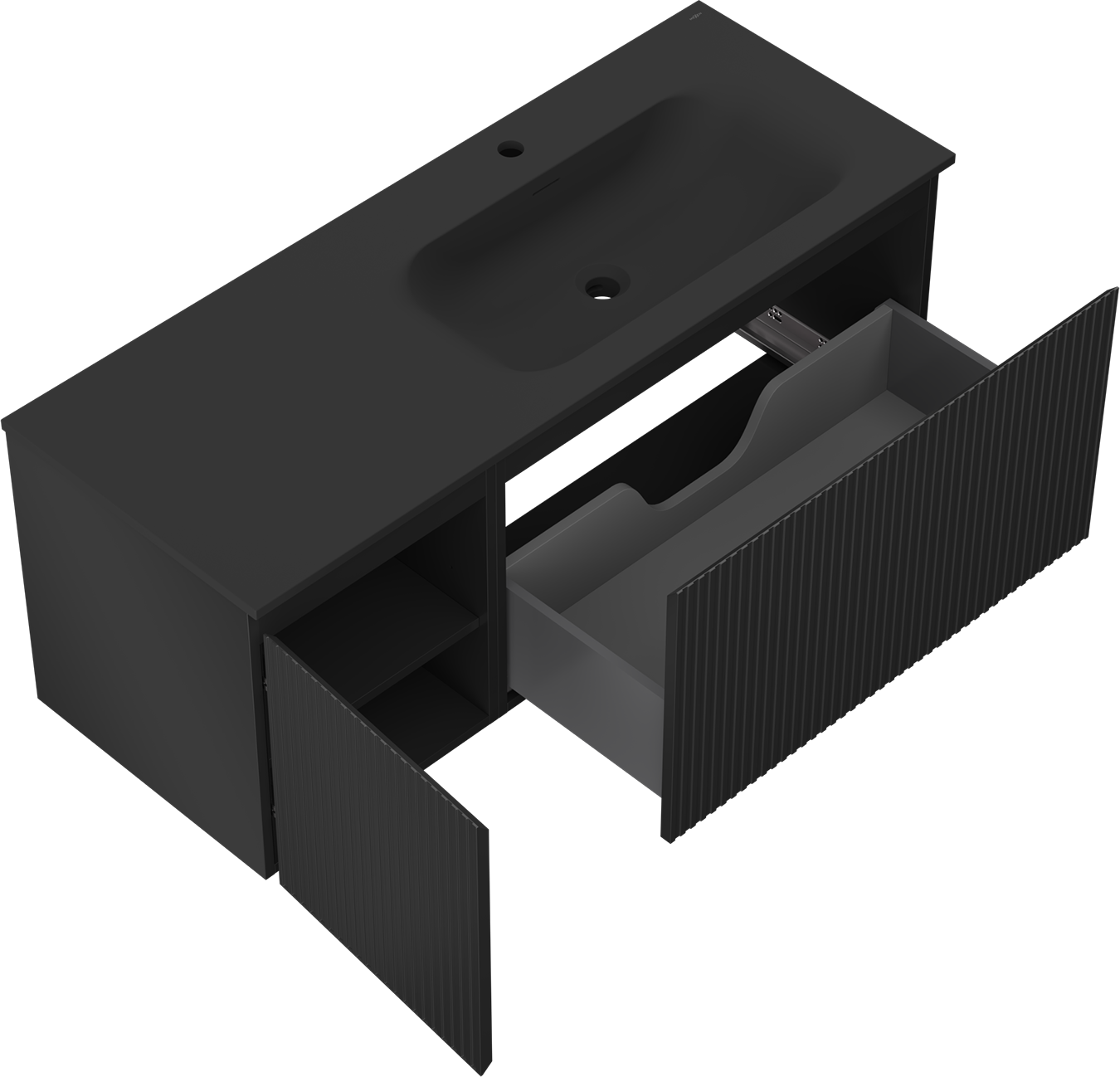 Изрезът в чекмеджето е проектиран по такъв начин, че да побере сифона, който е необходим в мивковите инсталации. Благодарение на това мебелът може да бъде монтиран напълно функционално, без да се налага отказване от пространството в чекмеджето заради инсталацията.