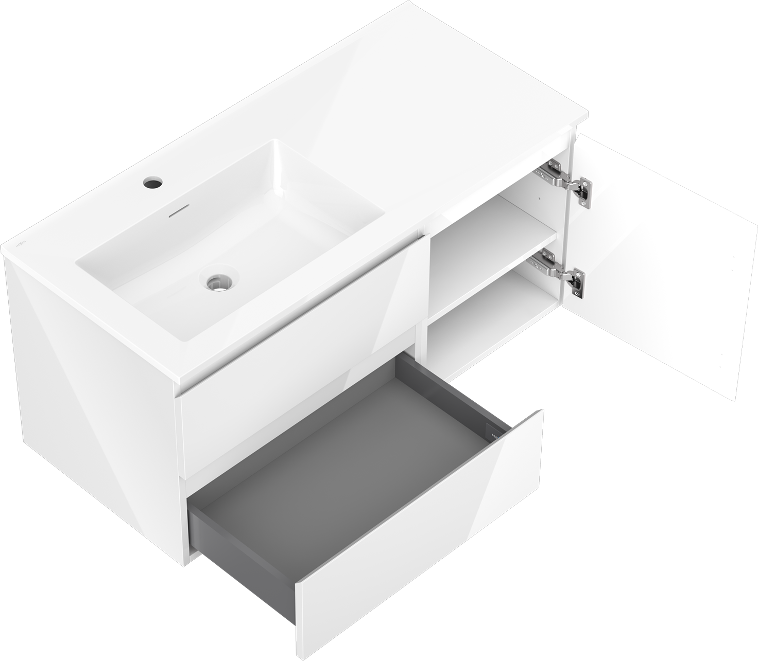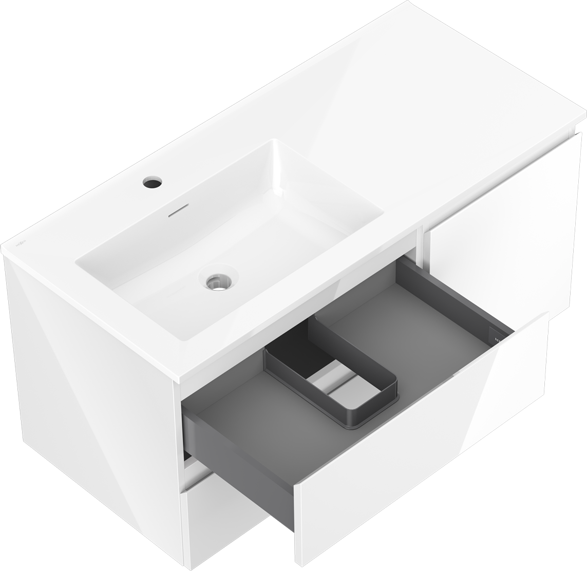 Изрезът в чекмеджето е проектиран по такъв начин, че да побере сифона, който е необходим в мивковите инсталации. Благодарение на това мебелът може да бъде монтиран напълно функционално, без да се налага отказване от пространството в чекмеджето заради инсталацията.