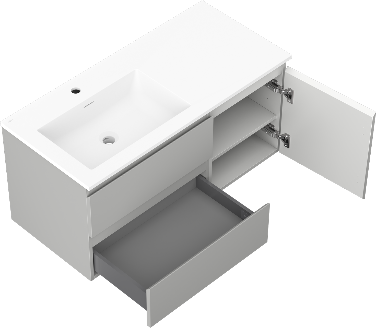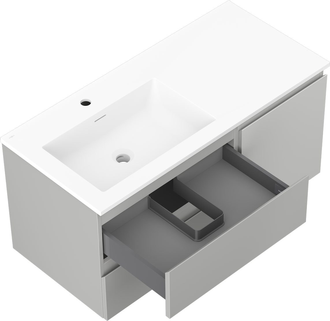 Изрезът в чекмеджето е проектиран по такъв начин, че да побере сифона, който е необходим в мивковите инсталации. Благодарение на това мебелът може да бъде монтиран напълно функционално, без да се налага отказване от пространството в чекмеджето заради инсталацията.