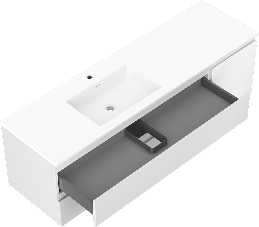 Изрезът в чекмеджето е проектиран по такъв начин, че да побере сифона, който е необходим в мивковите инсталации. Благодарение на това мебелът може да бъде монтиран напълно функционално, без да се налага отказване от пространството в чекмеджето заради инсталацията.