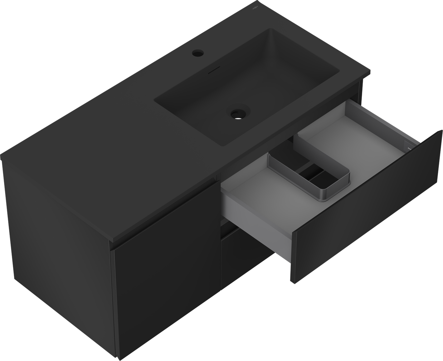 Изрезът в чекмеджето е проектиран по такъв начин, че да побере сифона, който е необходим в мивковите инсталации. Благодарение на това мебелът може да бъде монтиран напълно функционално, без да се налага отказване от пространството в чекмеджето заради инсталацията.