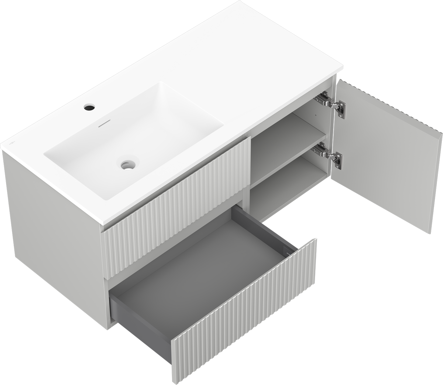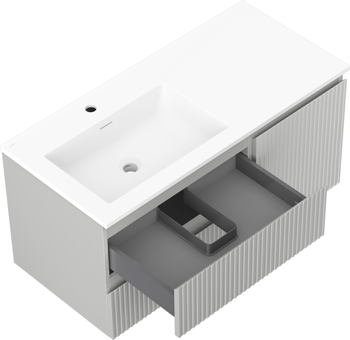 Изрезът в чекмеджето е проектиран по такъв начин, че да побере сифона, който е необходим в мивковите инсталации. Благодарение на това мебелът може да бъде монтиран напълно функционално, без да се налага отказване от пространството в чекмеджето заради инсталацията.