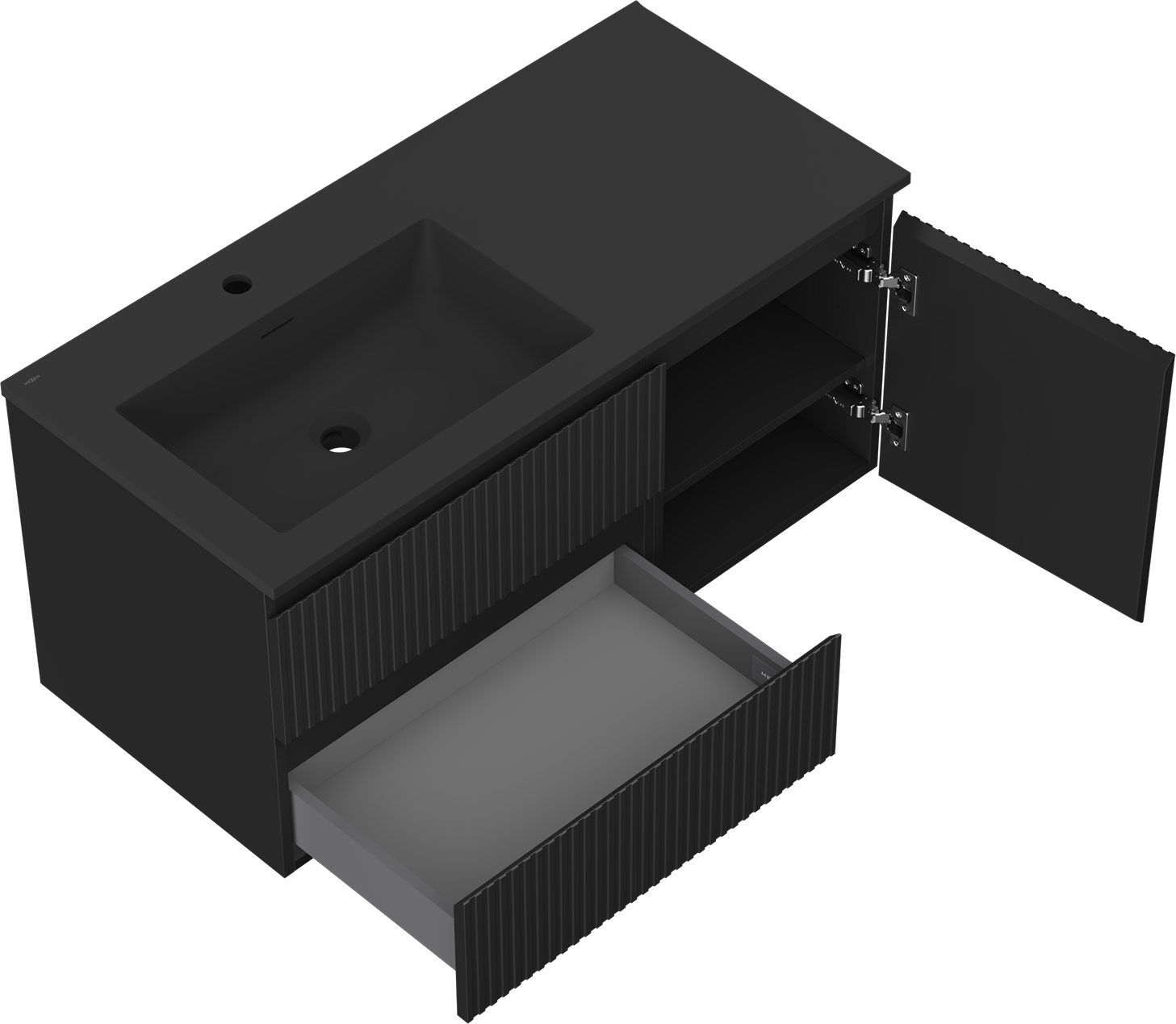 Изрезът в чекмеджето е проектиран по такъв начин, че да побере сифона, който е необходим в мивковите инсталации. Благодарение на това мебелът може да бъде монтиран напълно функционално, без да се налага отказване от пространството в чекмеджето заради инсталацията.