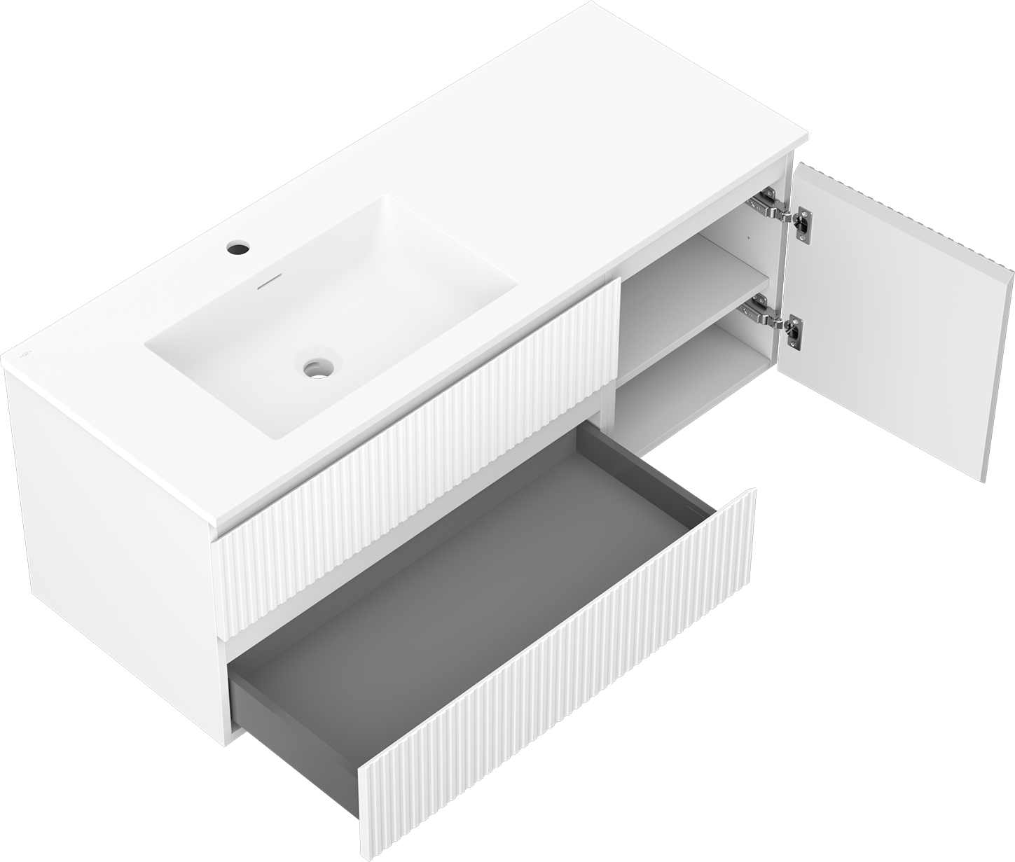 Изрезът в чекмеджето е проектиран по такъв начин, че да побере сифона, който е необходим в мивковите инсталации. Благодарение на това мебелът може да бъде монтиран напълно функционално, без да се налага отказване от пространството в чекмеджето заради инсталацията.