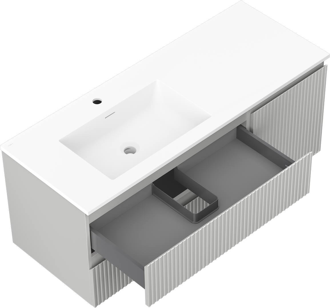 Изрезът в чекмеджето е проектиран по такъв начин, че да побере сифона, който е необходим в мивковите инсталации. Благодарение на това мебелът може да бъде монтиран напълно функционално, без да се налага отказване от пространството в чекмеджето заради инсталацията.