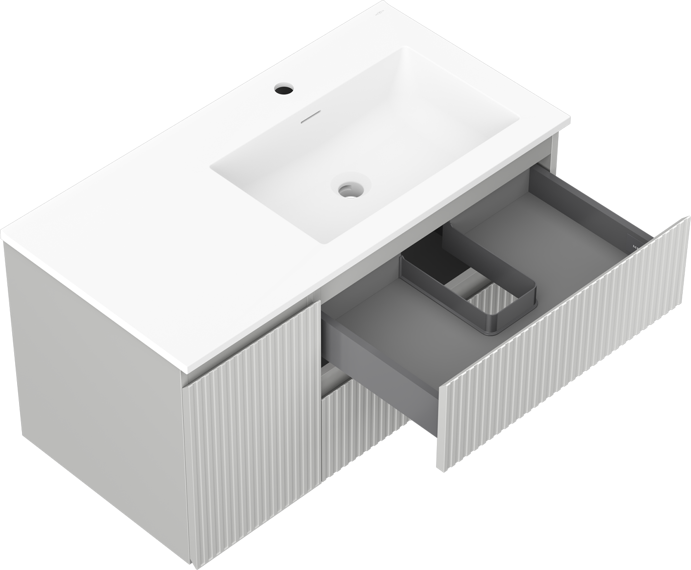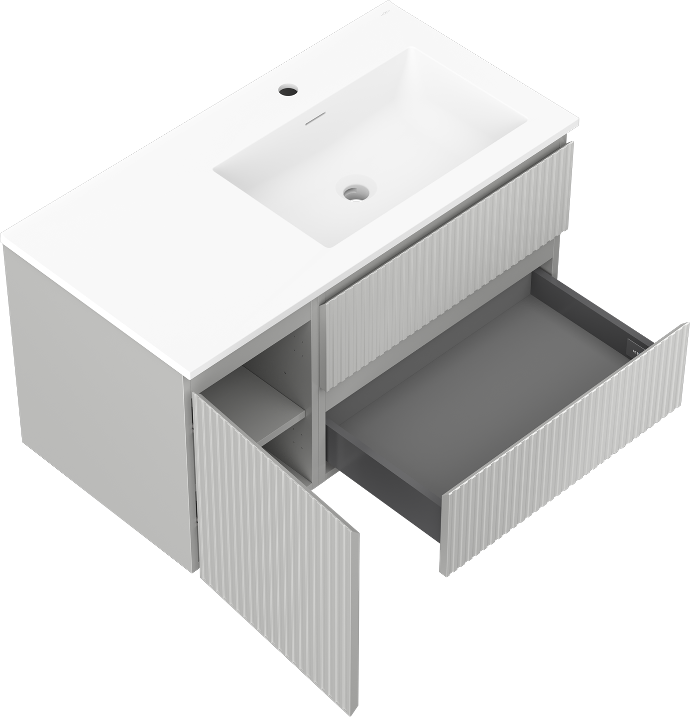 Изрезът в чекмеджето е проектиран по такъв начин, че да побере сифона, който е необходим в мивковите инсталации. Благодарение на това мебелът може да бъде монтиран напълно функционално, без да се налага отказване от пространството в чекмеджето заради инсталацията.
