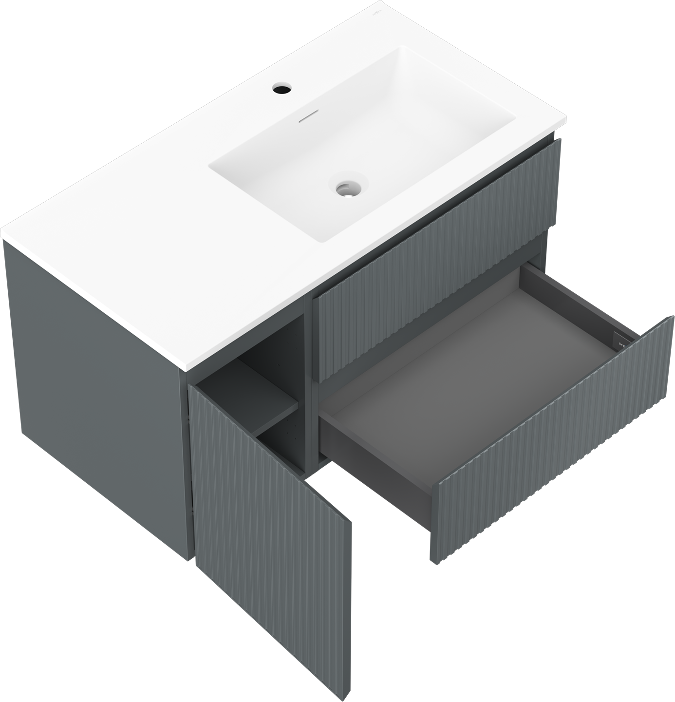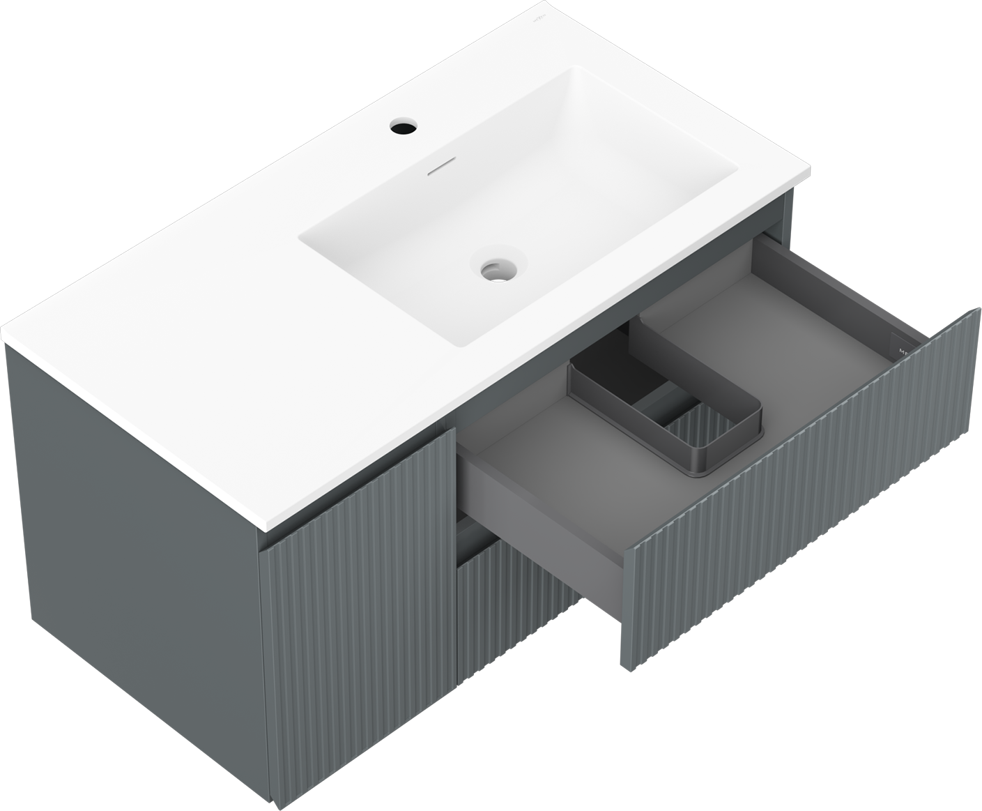 Изрезът в чекмеджето е проектиран по такъв начин, че да побере сифона, който е необходим в мивковите инсталации. Благодарение на това мебелът може да бъде монтиран напълно функционално, без да се налага отказване от пространството в чекмеджето заради инсталацията.