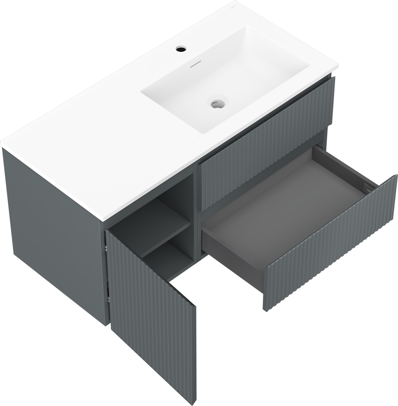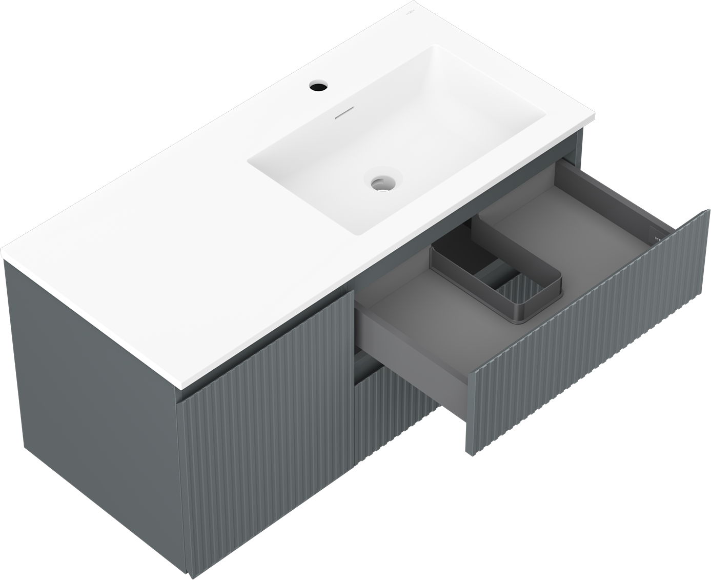 Изрезът в чекмеджето е проектиран по такъв начин, че да побере сифона, който е необходим в мивковите инсталации. Благодарение на това мебелът може да бъде монтиран напълно функционално, без да се налага отказване от пространството в чекмеджето заради инсталацията.