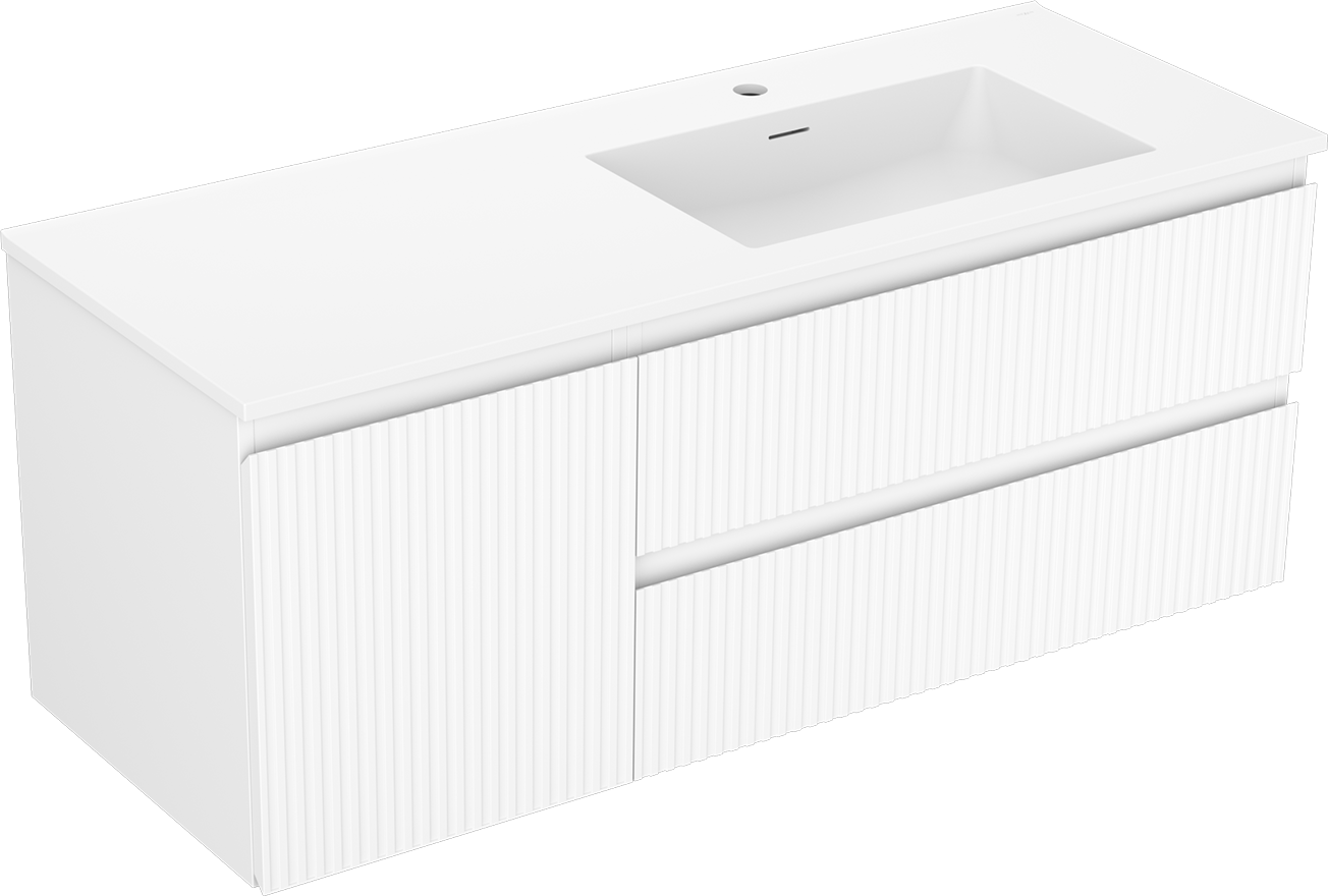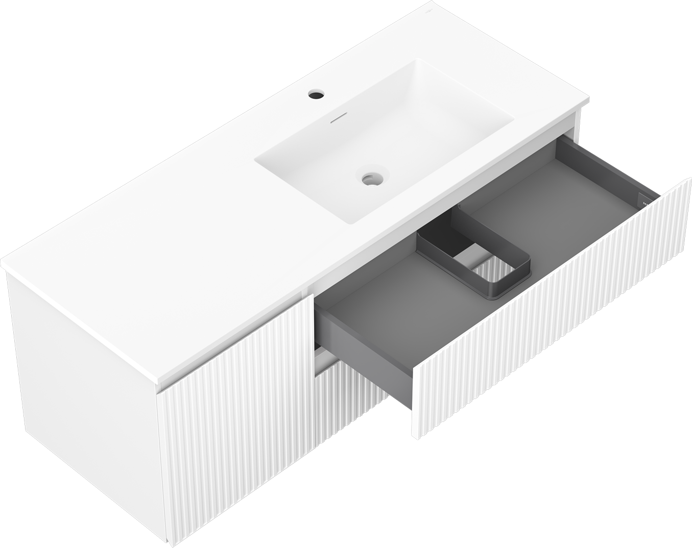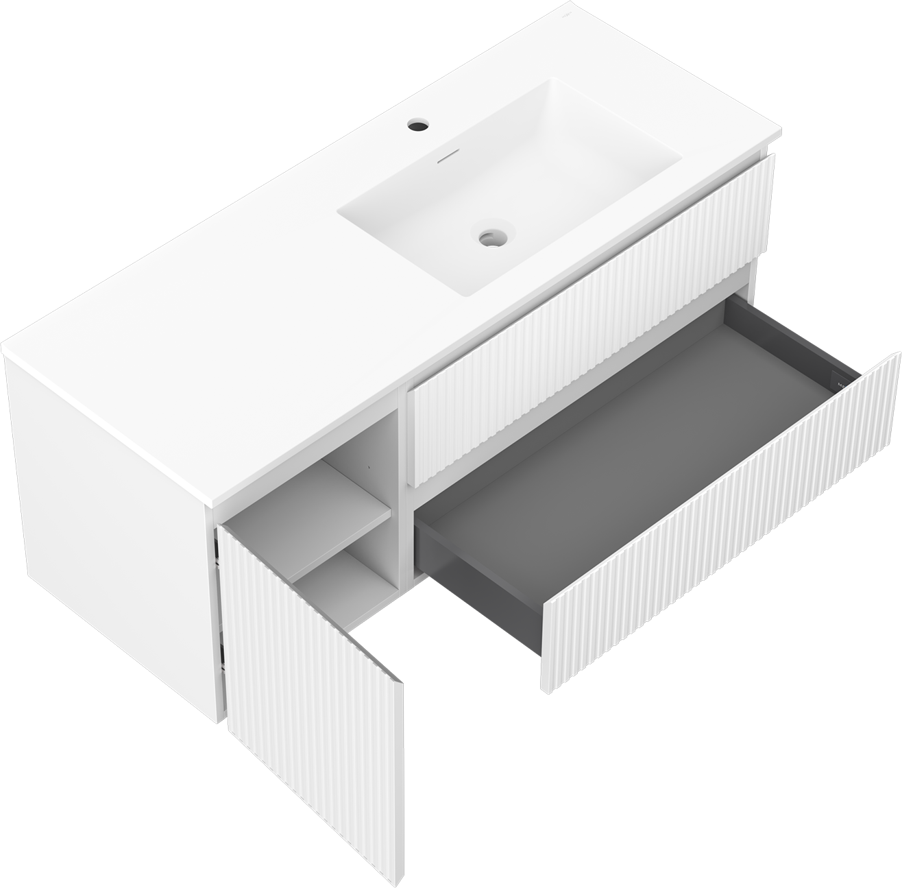 Изрезът в чекмеджето е проектиран по такъв начин, че да побере сифона, който е необходим в мивковите инсталации. Благодарение на това мебелът може да бъде монтиран напълно функционално, без да се налага отказване от пространството в чекмеджето заради инсталацията.