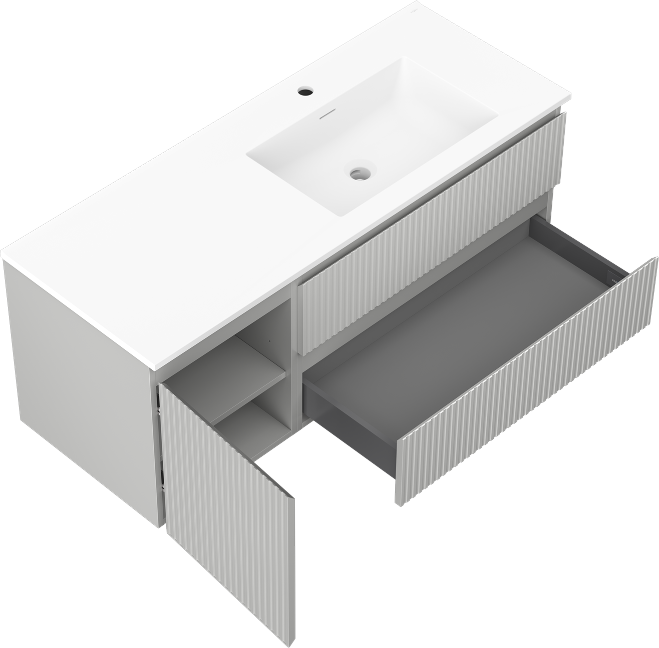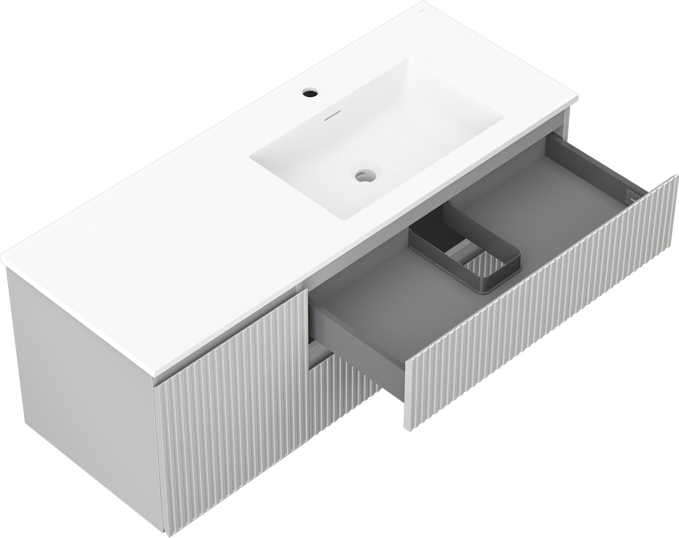 Изрезът в чекмеджето е проектиран по такъв начин, че да побере сифона, който е необходим в мивковите инсталации. Благодарение на това мебелът може да бъде монтиран напълно функционално, без да се налага отказване от пространството в чекмеджето заради инсталацията.