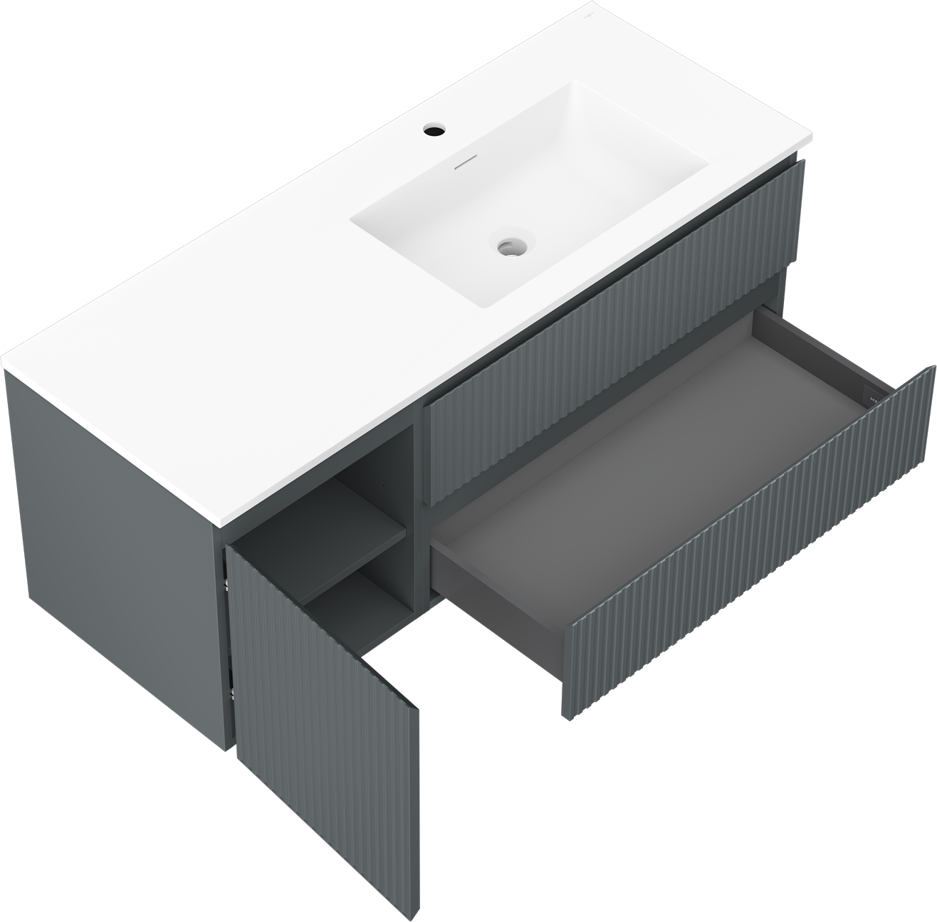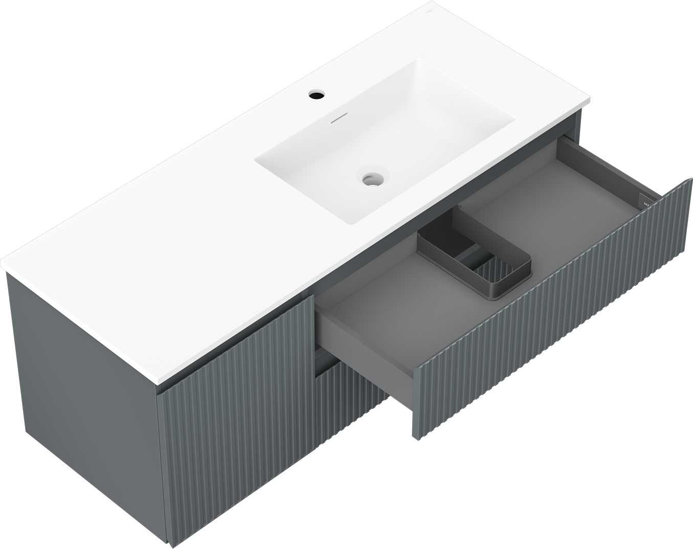 Изрезът в чекмеджето е проектиран по такъв начин, че да побере сифона, който е необходим в мивковите инсталации. Благодарение на това мебелът може да бъде монтиран напълно функционално, без да се налага отказване от пространството в чекмеджето заради инсталацията.