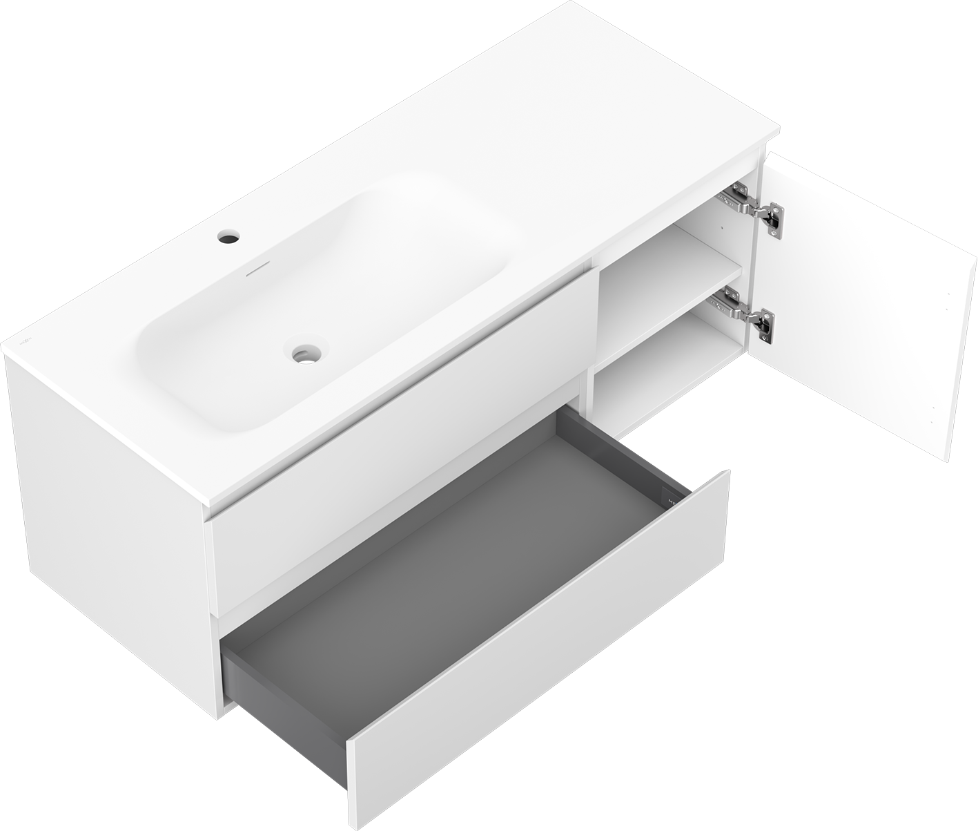 Изрезът в чекмеджето е проектиран по такъв начин, че да побере сифона, който е необходим в мивковите инсталации. Благодарение на това мебелът може да бъде монтиран напълно функционално, без да се налага отказване от пространството в чекмеджето заради инсталацията.