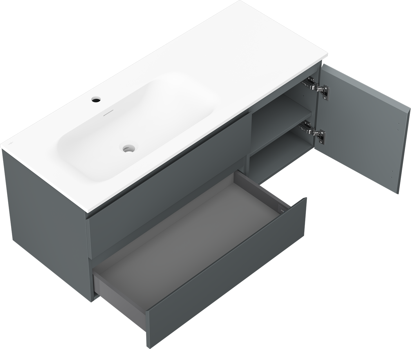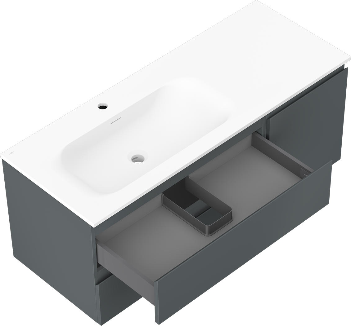 Изрезът в чекмеджето е проектиран по такъв начин, че да побере сифона, който е необходим в мивковите инсталации. Благодарение на това мебелът може да бъде монтиран напълно функционално, без да се налага отказване от пространството в чекмеджето заради инсталацията.