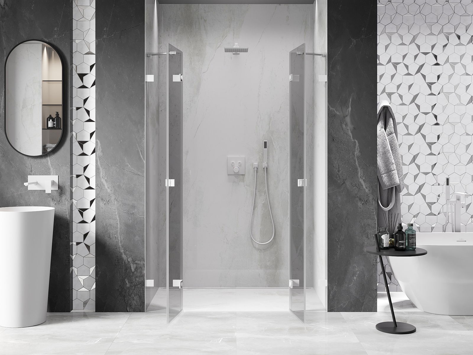 Удобната и практична дръжка е изработена от здрав и устойчив метал. Модерната форма в съчетание с покритието, съответстващо на цвета на профилите, придава на цялото модерен и стилен вид, подчертавайки естетиката на всяка баня.