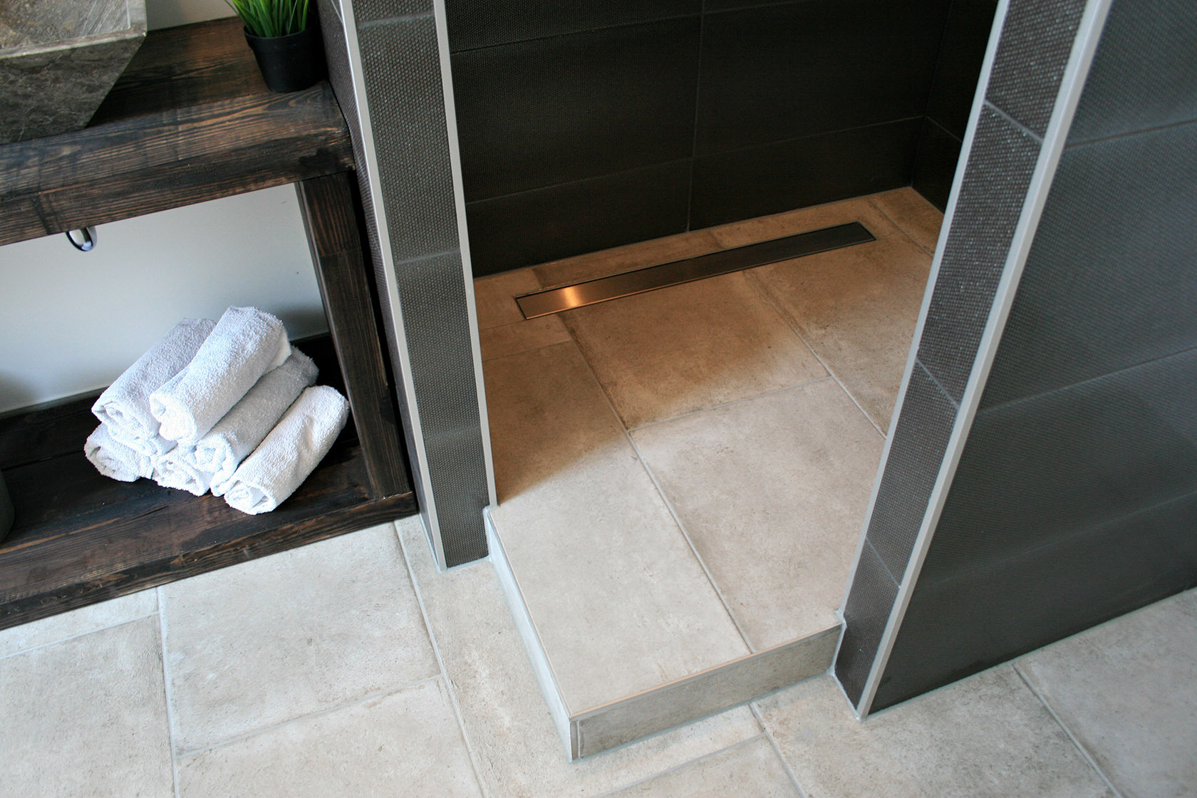 - инсталация на линейното оттичане – трябва да се помни за правилното местоположение на решетката за оттичане, която трябва да бъде 1-2 милиметра под нивото на пода;