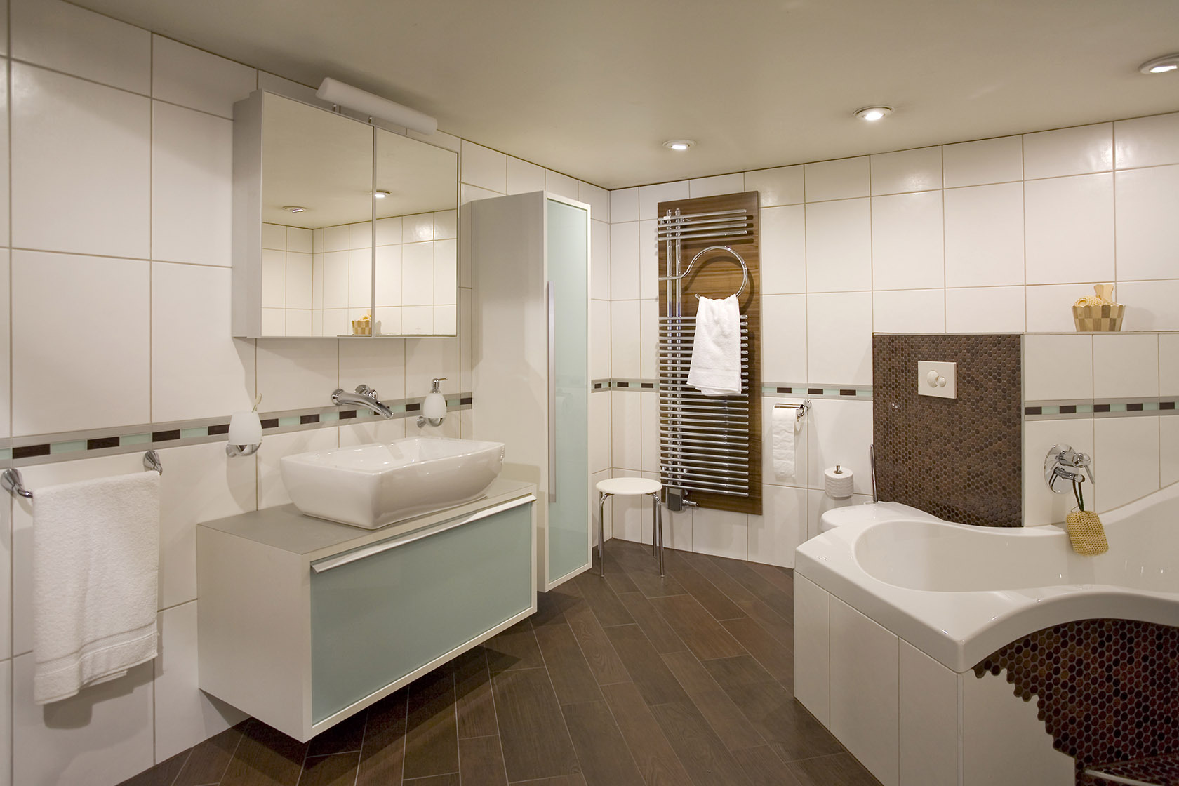 В класическото оборудване за баня ще открием бели шкафове, които ще се представят идеално във всяко минималистично баня. Освен това те оптически увеличават помещението, а огледалото е чудесно допълнение в малка баня. Напоследък много популярни са черните шкафове за баня. Те се представят много добре в съвременно обзаведените бани както и в онези, които са изключително елегантни, въпреки че са класически. Мат или с високо гланцово покритие, те допълнително придават съвършена композиция и показват изтънчения вкус на собственика.
