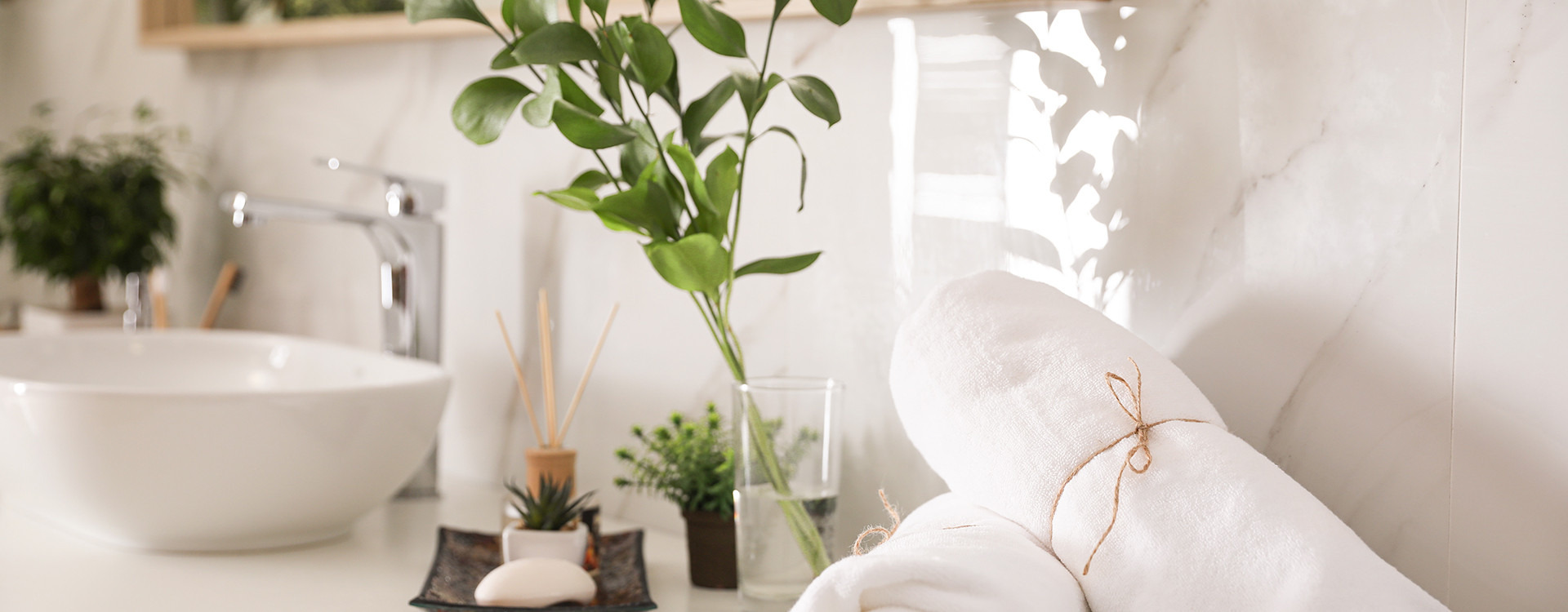 Относно светлината за растенията в банята, най-добре е да е отворена площ с много светлина. Но какво, ако банята и прозорецът са малки? Тогава трябва да намерим оптимално решение и да поставим растението така, че да е възможно най-близо до източника на светлина. Ако банята няма прозорец, по-добре е да се откажем от саксийни цветя. Алтернатива са отрязани цветя, също така красиви и внасящи неповторима атмосфера. Трябва само да помним редовно да сменяме водата им. Можем също така да се изкушим да използваме препарати, които, добавени към водата с цветята, удължават тяхната дълготрайност във вазата.