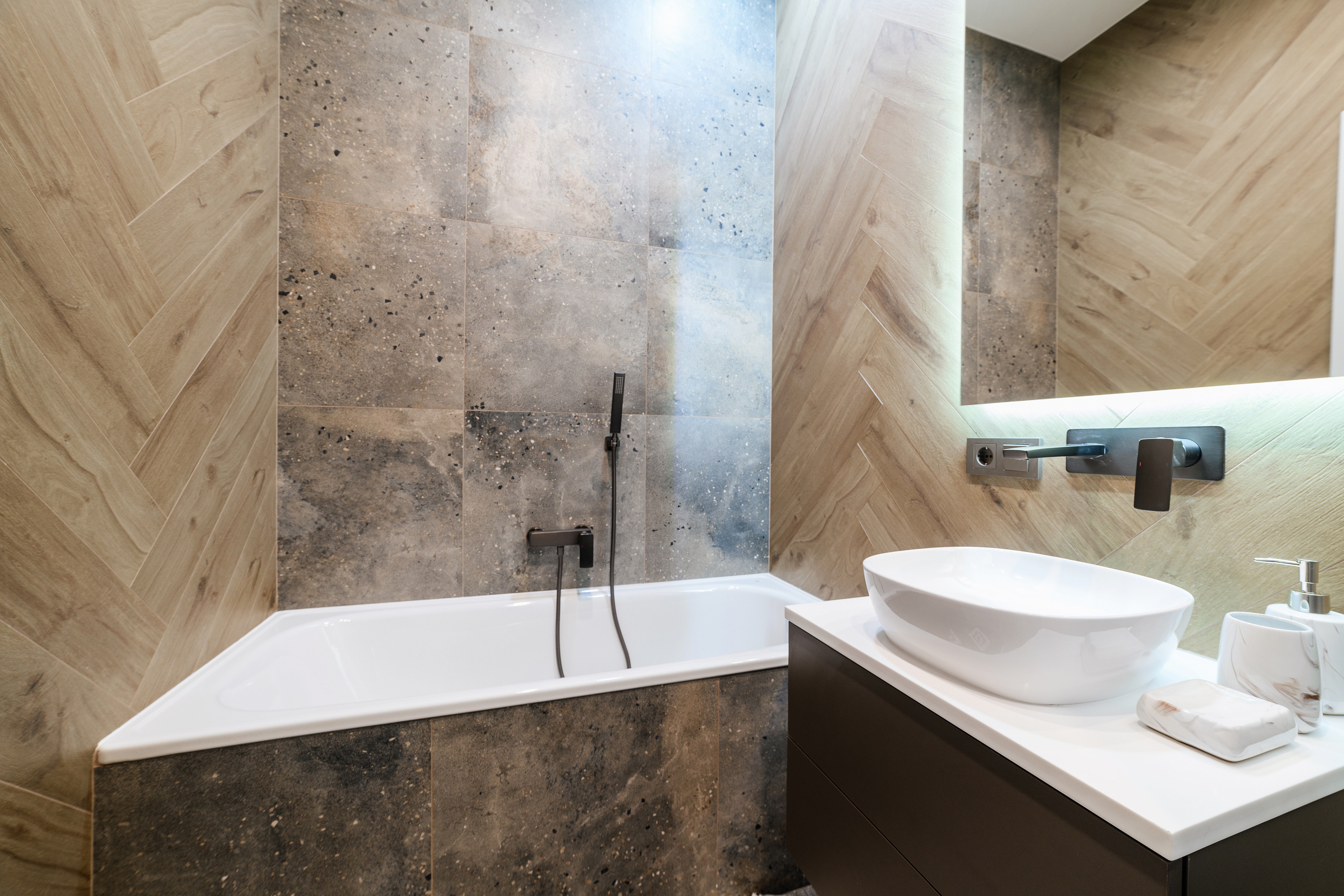 В Mexen вярваме, че за класата на интериора решават детайлите. Ако в твоята баня се появи черна фуга, тя ще бъде идеалното допълнение за черния санитарен фитинг. Такова съчетание прави фугите за плочки с дървесен ефект част от по-широка аранжировка. Ако пък дизайнерите на интериора залагат на злато или мед, изберете цвят на фугата за плочки в топли, кафяви нюанси. Тайнственият цвят подчертава блясъка на метала от батериите за умивалници и душове, създавайки хармонична цялост с плочките, имитиращи дърво.